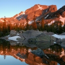 Hallet's Peak reflected in Lake Haiyaha at dawn in Rocky Mountain National Park.