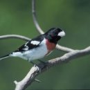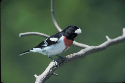Male rose-breasted grosbeak on branch in breeding plummage.