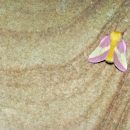 Moth with fuzzy yellow body and pink and white wings, viewed from above resting on stone.