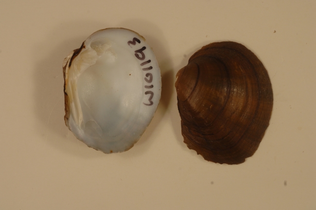 NCTC Freshwater Mussels Teaching Collection: Order: Unionoida Family: Unionidae Genus (ITIS): Pleurobema Species: sintoxia Williams et al.: Use to be: Location Name: Wolf River, downstream of Hwy 22 bridge, Shawano Location State: WI