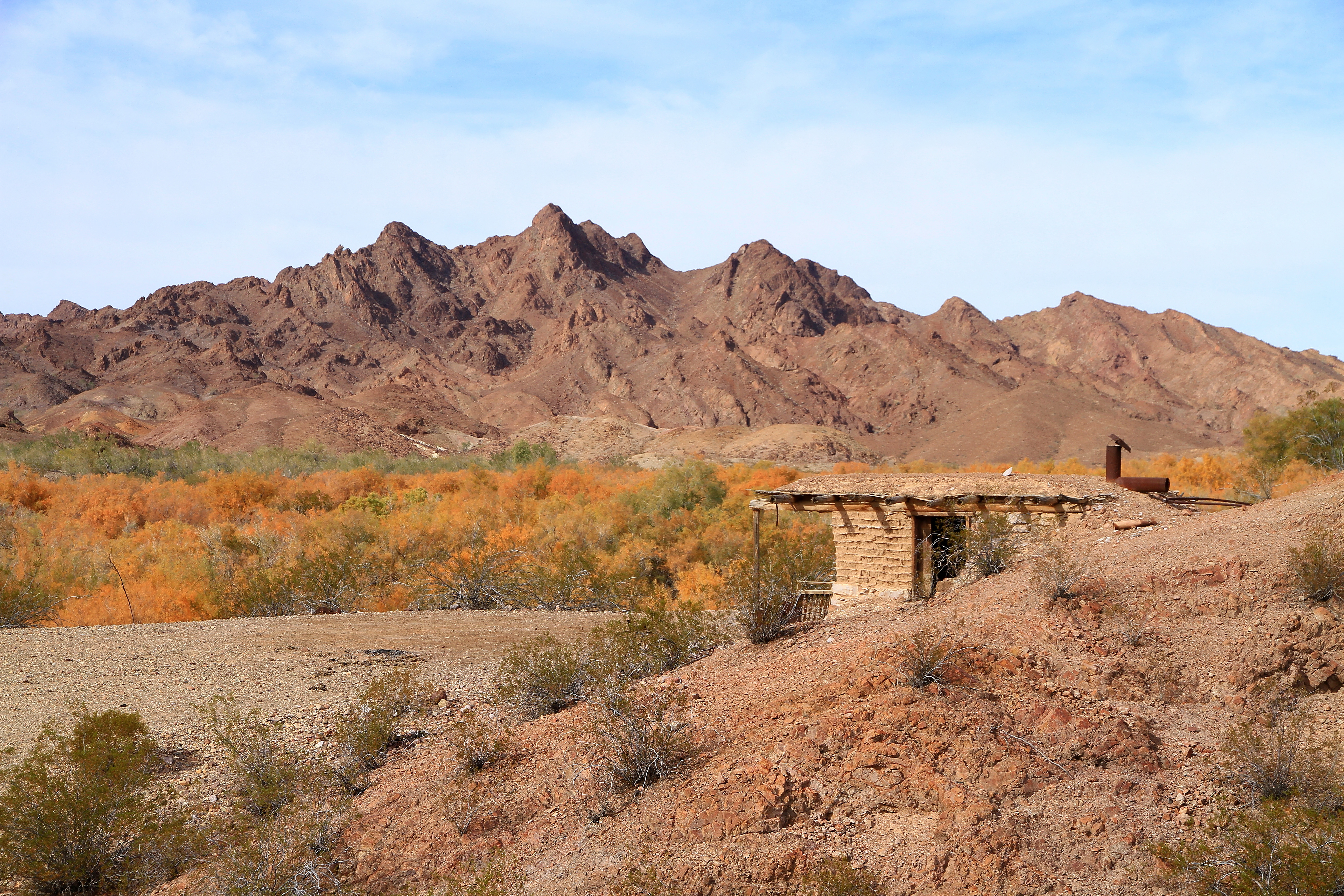 Abandoned, rustic cabin in arid mountain landscape at Imperial NWR.