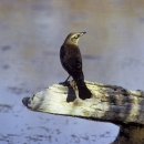 A Rusty Blackbird perches on a log in the DeSoto National Wildlife Refuge located in Iowa.