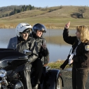 Refuge employee Sallie Gentry speaks with visitors on a motorcycle at William L. Finley NWR