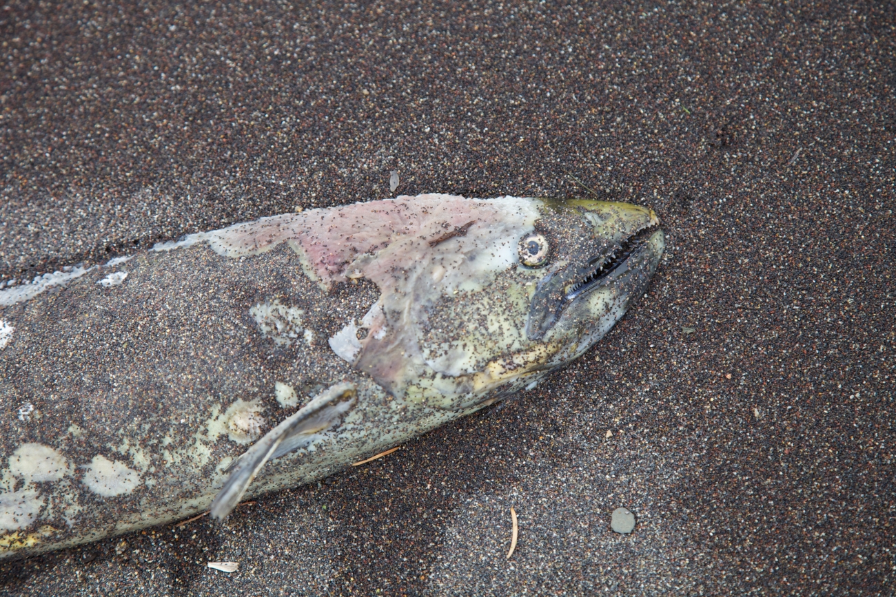 Fall Chinook Salmon carcass on the Columbia River shoreline.