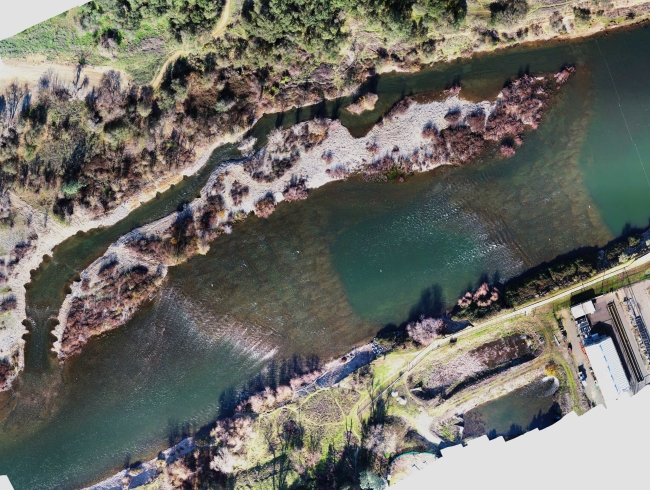 Salmonid redds on two gravel bars constructed on the Lower American River in California.