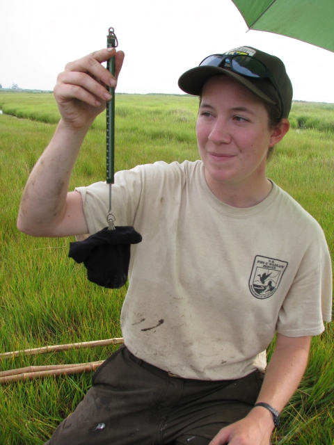 Forsythe SCEP student conducting telemetry on Saltmarsh sparrow