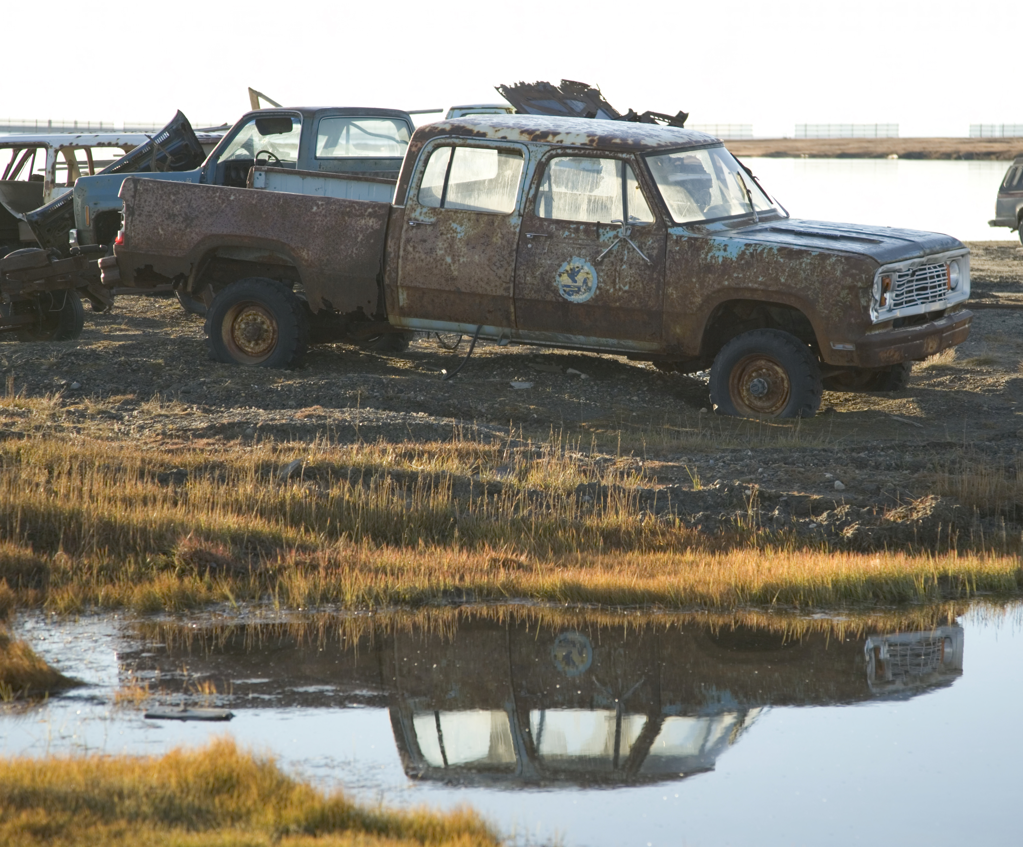 Picture shows a rusted U.S. Fish and Wildlife Service truck and other abandoned vehicles at the refuge.