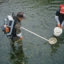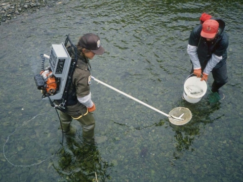 Brad Benter and Jud Scott use a backpack electroshocker to sample a creek on Adak, an island in the Aleutian chain. Image taken in 1993. Field Offices; Kenai Fishes and Wildlife Field Office; Kenai FO Gallery; Aleutians; AI153