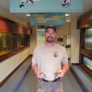 Edenton National Fish Hatchery Deputy Manager Sam Pollocks welcomes two American Alligators to their new home. Their exhibit is the one to his left.