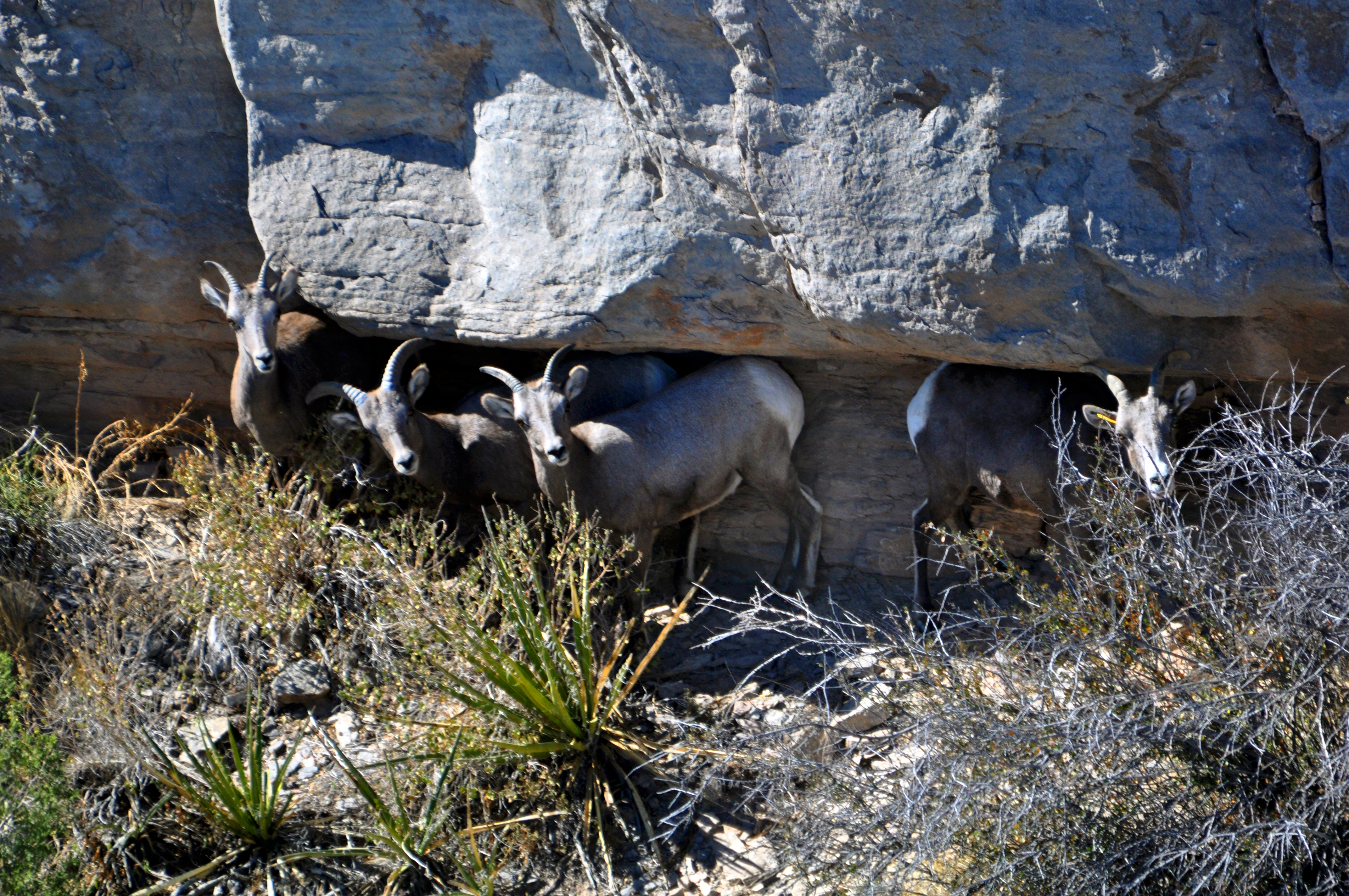 Four desert bighorn sheep ewes and young ram in a rock overhang opening on San Andres National Wildlife Refuge.