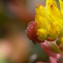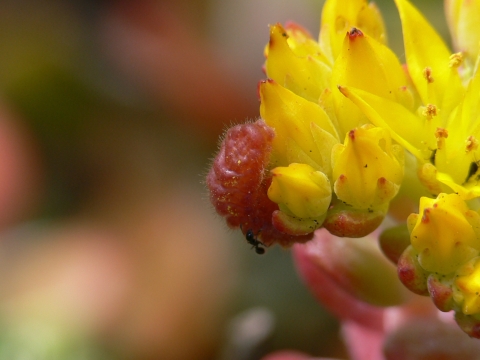 A San Bruno Elfin larvae coexists harmoniously with ants on its host plant, stonecrop (Sedum spathulifolium).