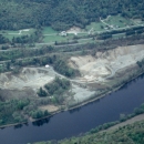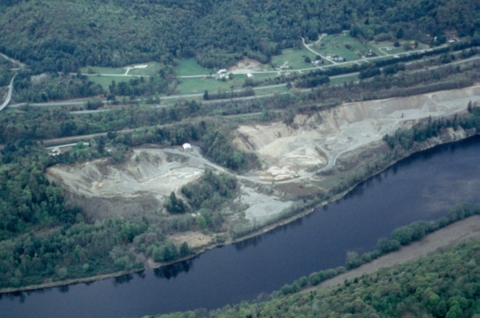 Aerial view of sand and gravel mine at edge of river, showing environmental damage hidden from public view by tree lines, and siltation of river due to runoff and erosion. Near towns of Hartland and Plainfield, Vermont.