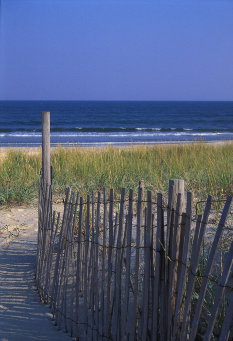 View of sand dunes with a stabilizing fence overlooking the ocean