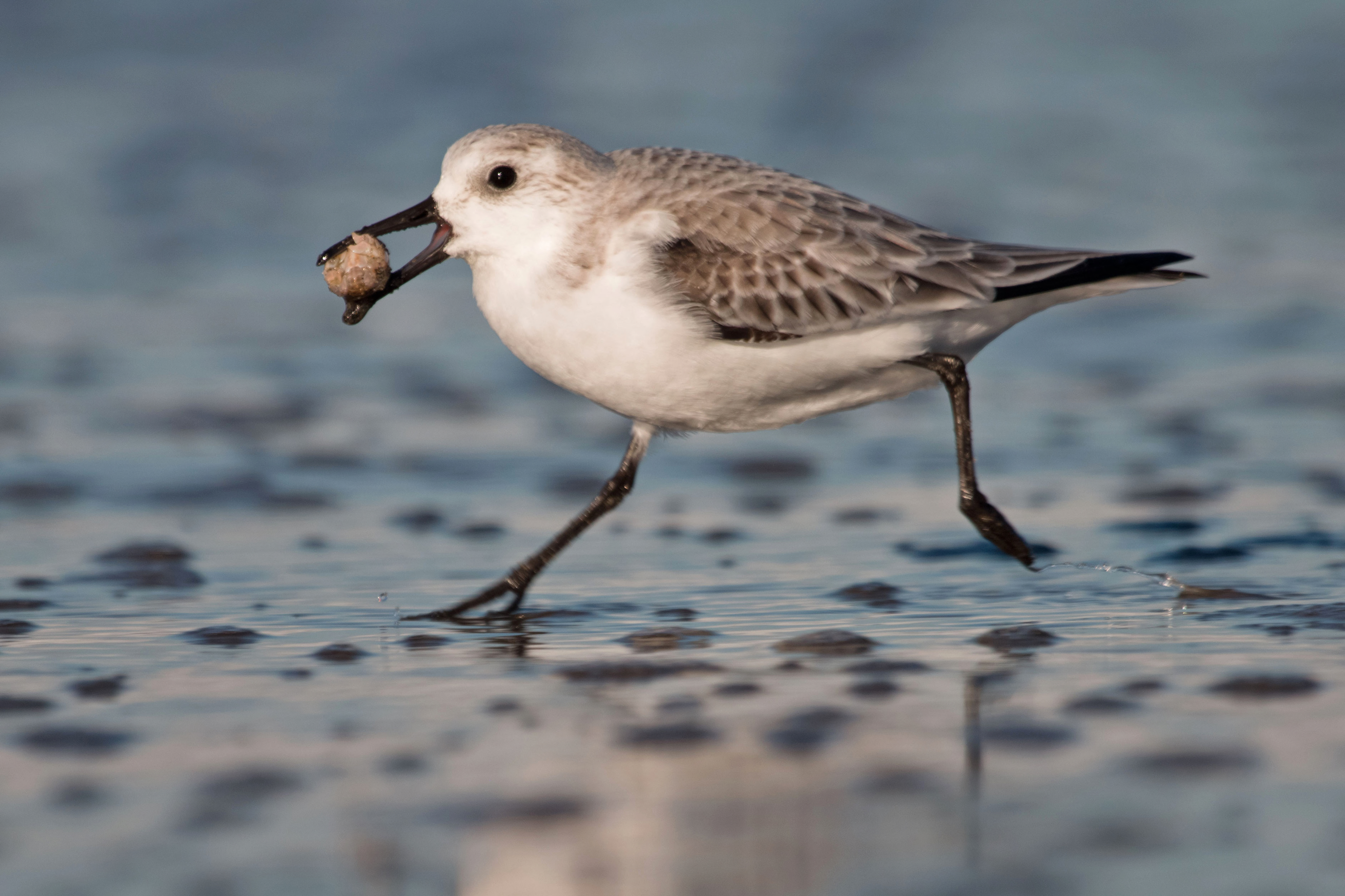 Sanderling has caught a small mole crab.