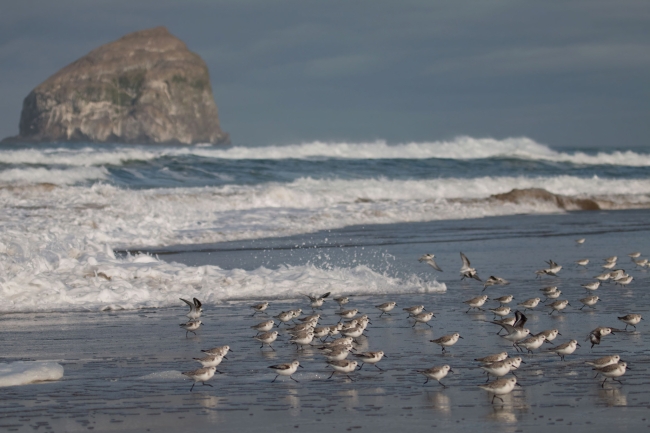 Sanderlings run up and down the beach chasing waves at Pacific City, OR.