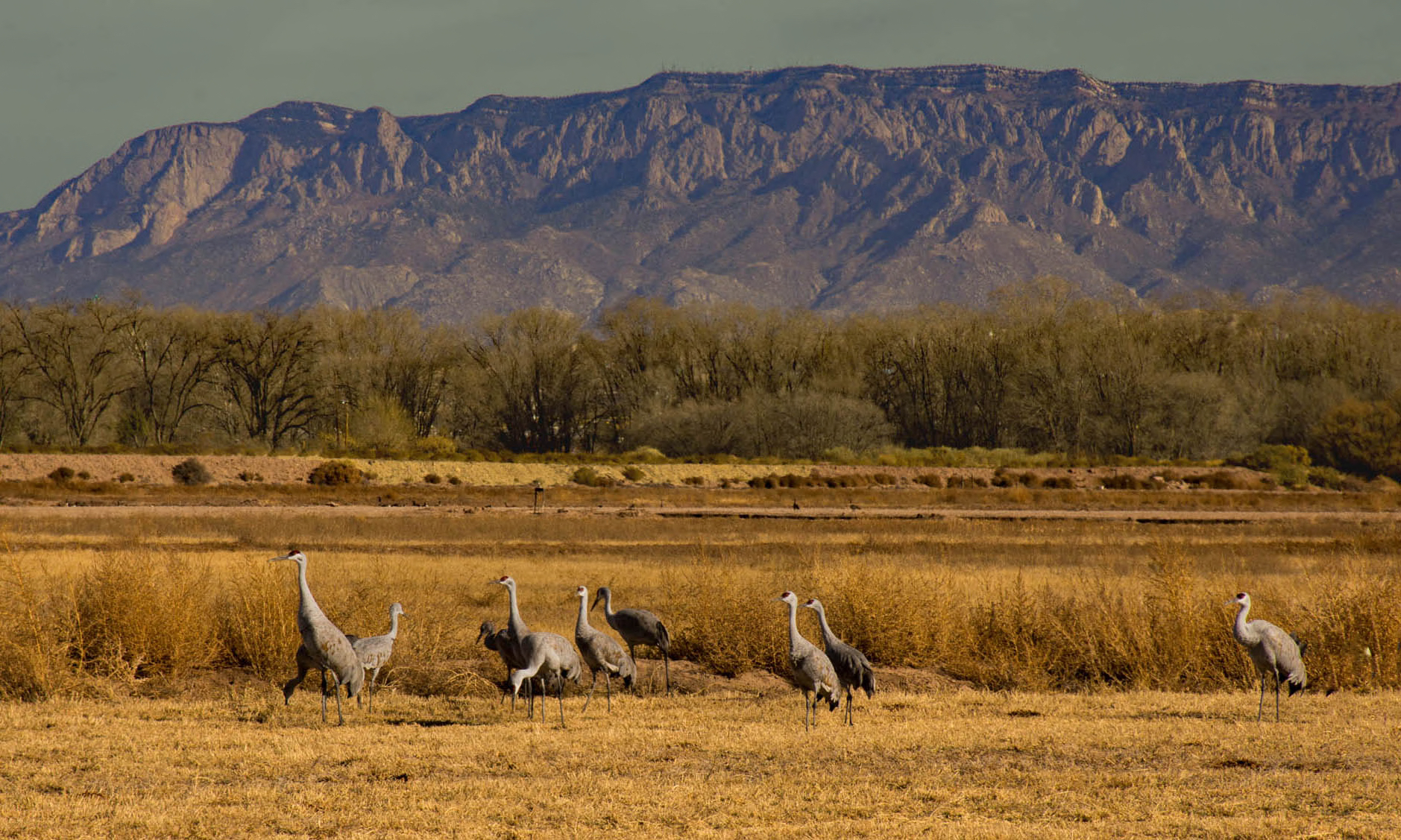 Sandhill Cranes stand in a field at Valle de Oro NWR with Sandia Mountains in background. 2017 Valle de Oro Photo Contest 2nd Place: Landscape Category