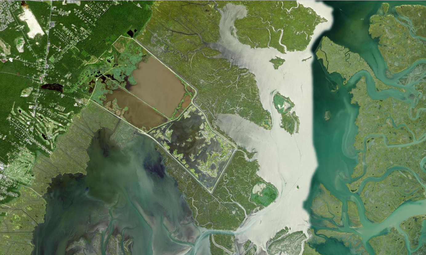 A satellite view of Wildlife Drive at Edwin B. Forsythe National Wildlife Refuge in New Jersey and surrounding tidal salt marsh.