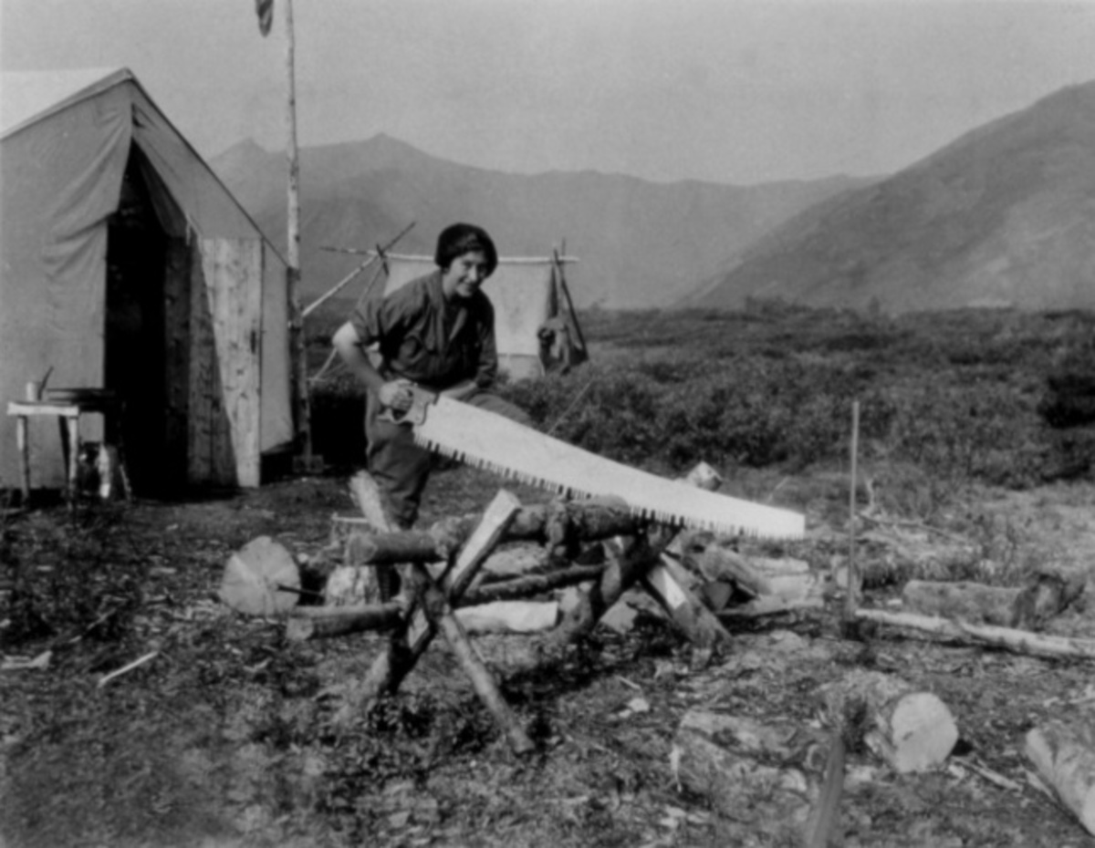 Mardy Murie with big saw, tent in background. Environmental Sciences;