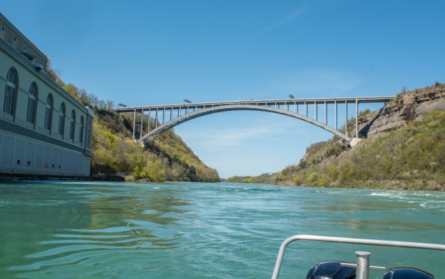 Scenic view of powerhouse and bridge on Niagara River