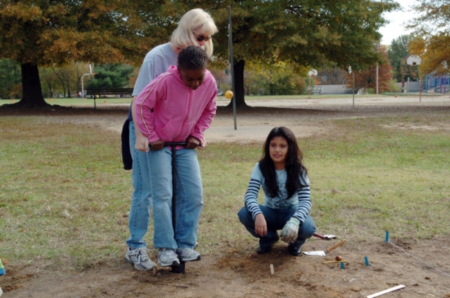 Teacher assists students in starting hole to plant tulips in their schoolyard habitat project