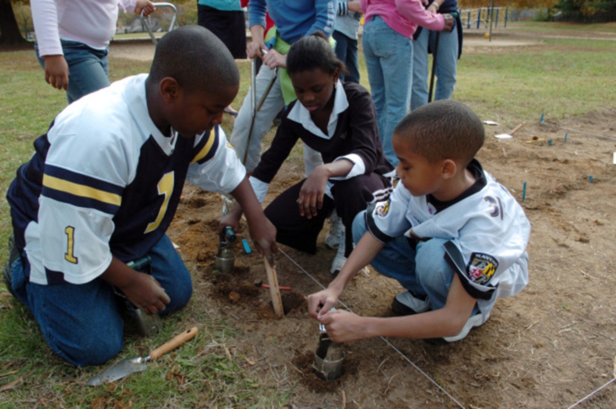 Children measuring hole to make sure it is deep enough for planting tulips