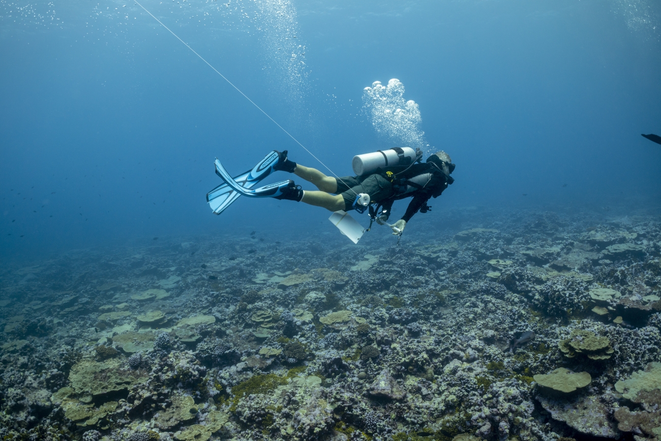 Scientific diver searching for crown-of-thorns starfish