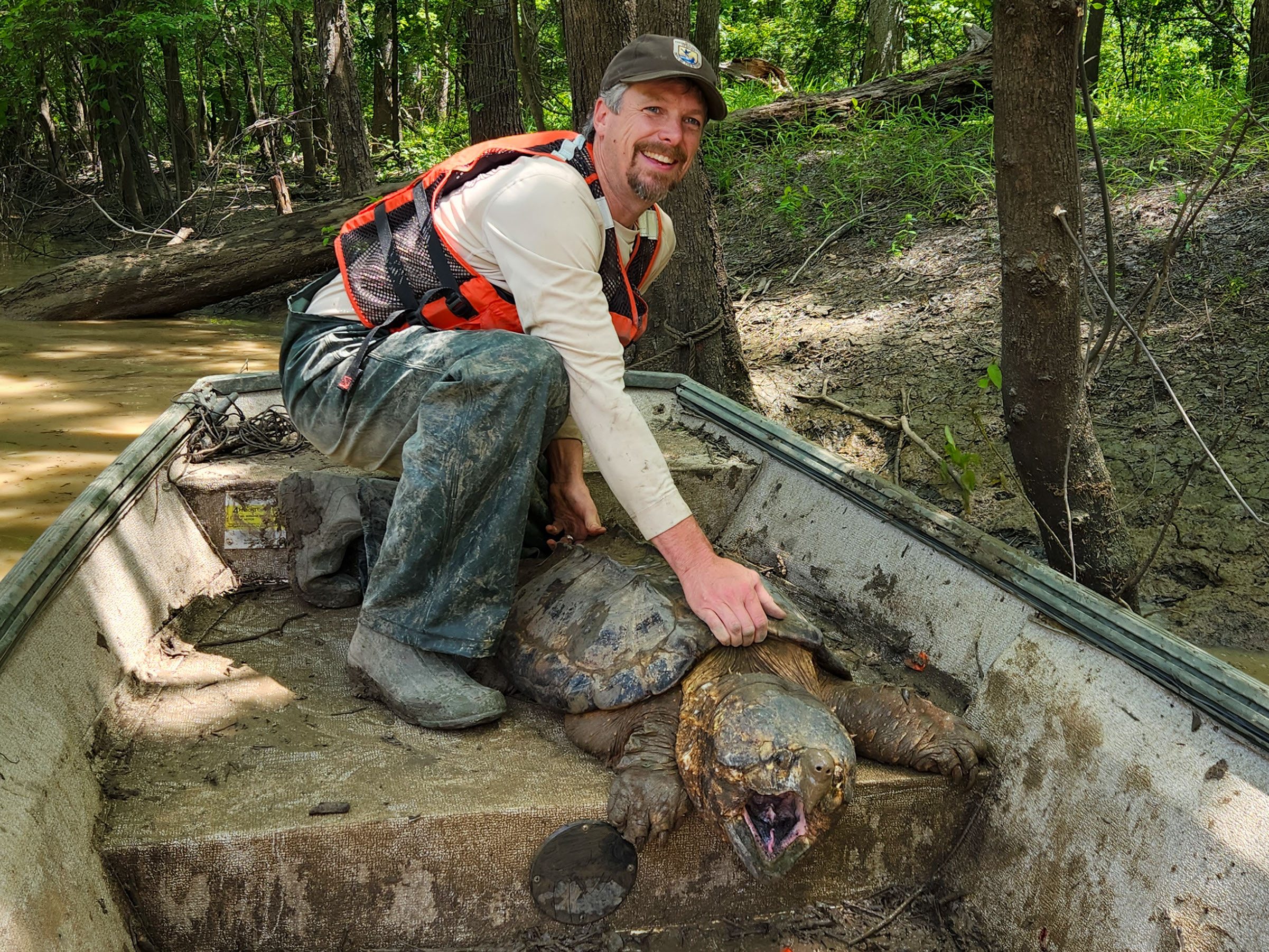Assistant Refuge Manager Arthur "Jay" Hitchcock prepares to release a 114 pound, male alligator snapping turtle in Dale Bumpers White River National Wildlife Refuge May 16, 2024 .