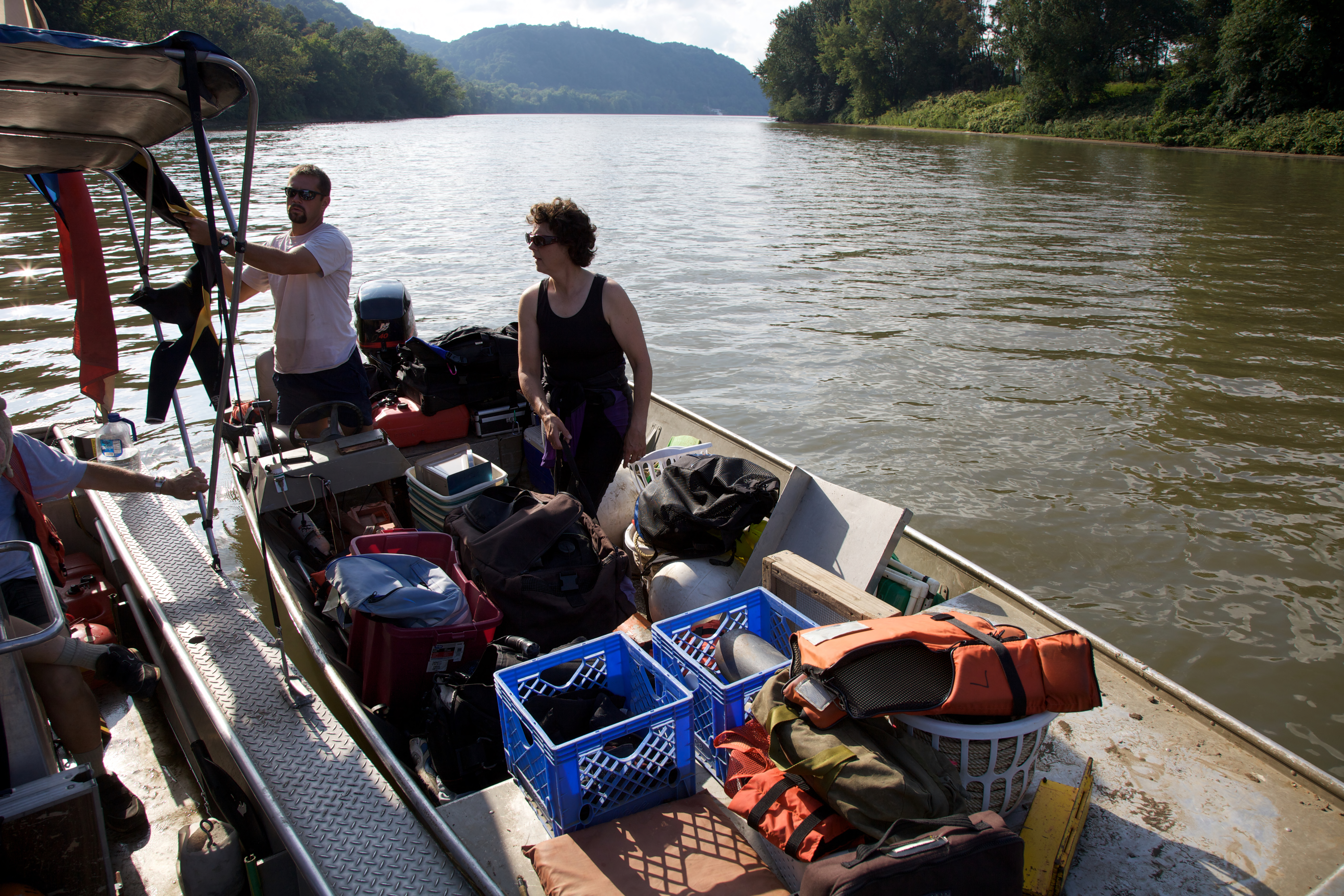 Ohio River Islands National Wildlife Refuge personnel in a boat on the Ohio River.