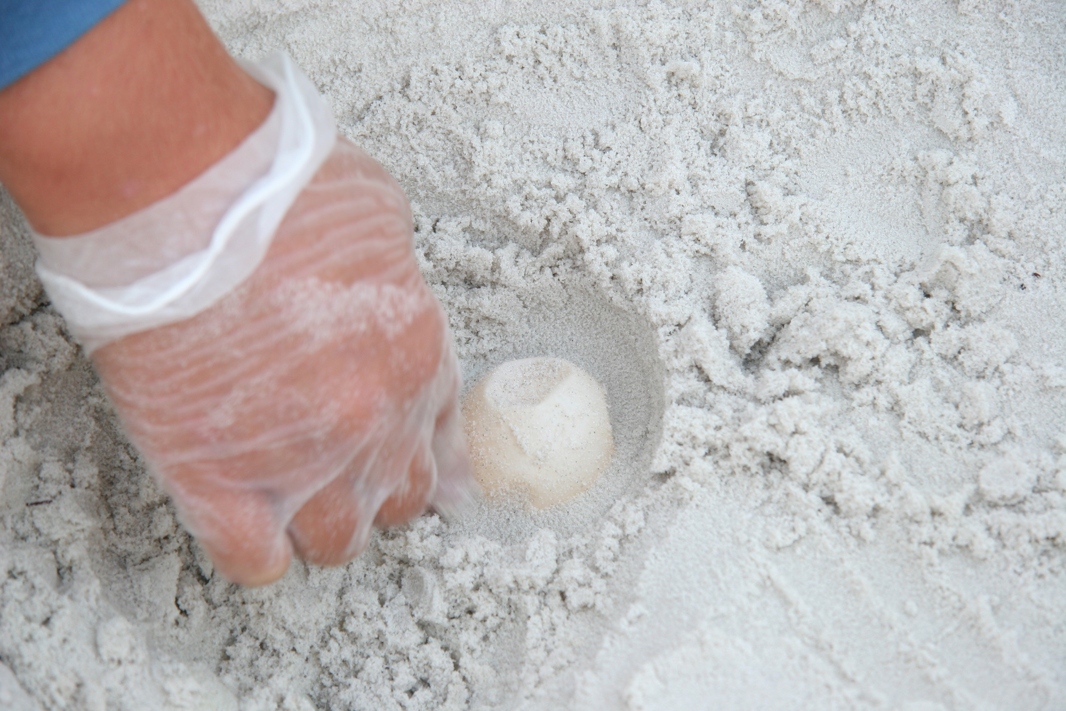 Port St. Joe, FL: When uncovering an egg, the proper method is to gently circle the egg with your finger to begin to dislodge it from the sand.