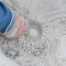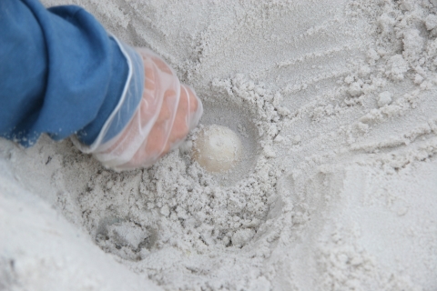 Port St. Joe, FL: University of Florida student Hope Ronco circles around an egg to help loosen it from the sand.