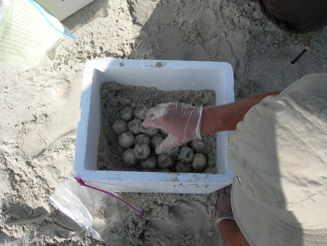 Apalachicola, FL July 19, 2010. St. Vincent National Wildlife Refuge personnel remove the 5th of about 50 sea turtle nests at St. Vincent National Wildlife Refuge. Sand from the nest insulates about 130 eggs in a Styrofoam box.