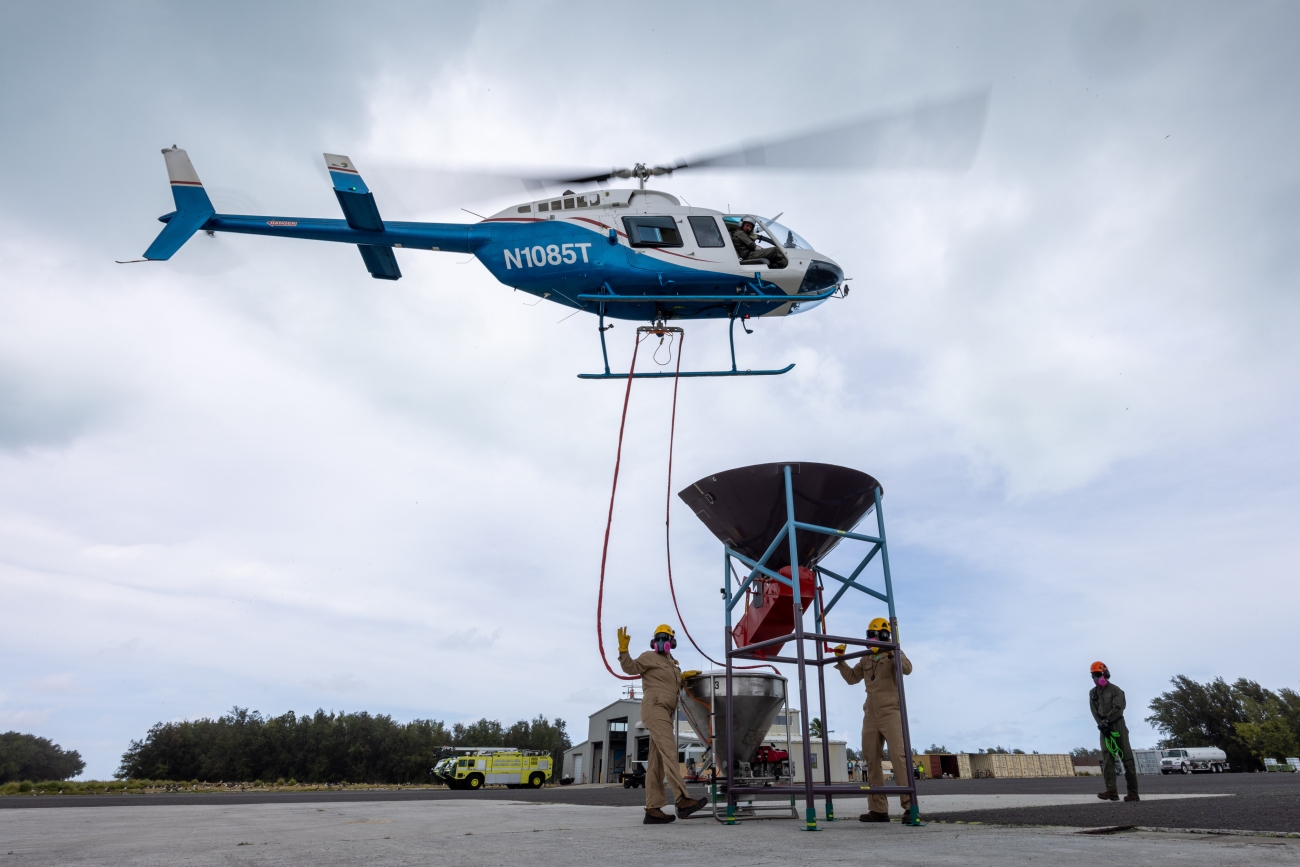 A helicopter is hoisted to a mixer for rodenticide, in an effort to rid Midway Atoll National Wildlife Refuge of invasive house mice that have been attacking albatrosses.