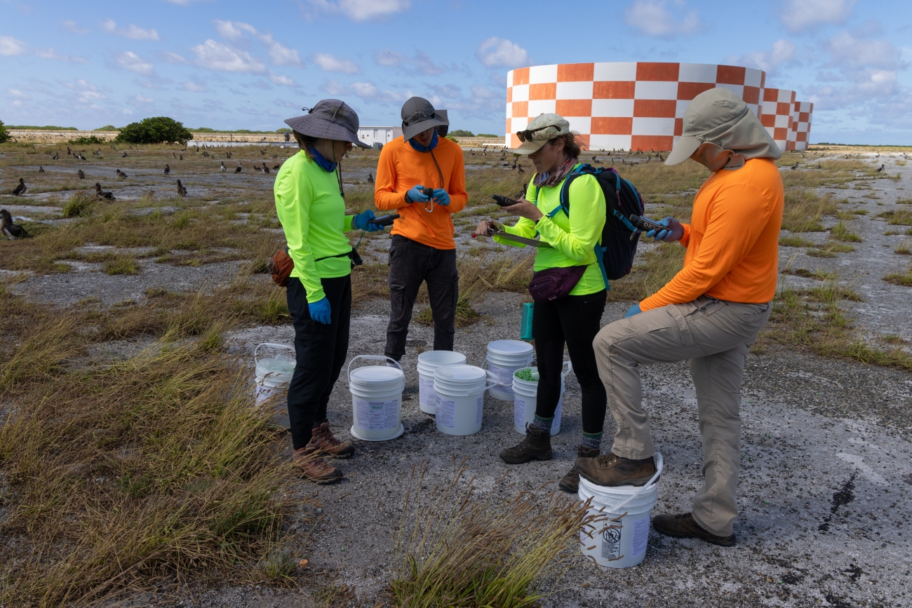 Members of the Seabird Protection Project at Midway Atoll National Wildlife Refuge monitor their GPS units for mice baiting areas. The project aimed to eradicate house mice that have been attacking albatrosses on Sand Island, the larger of the two islands that make up Midway Atoll in the North Pacific.