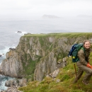 A biologist hikes from a seabird survey point on Chowiet Island in Alaska Maritime Refuge.