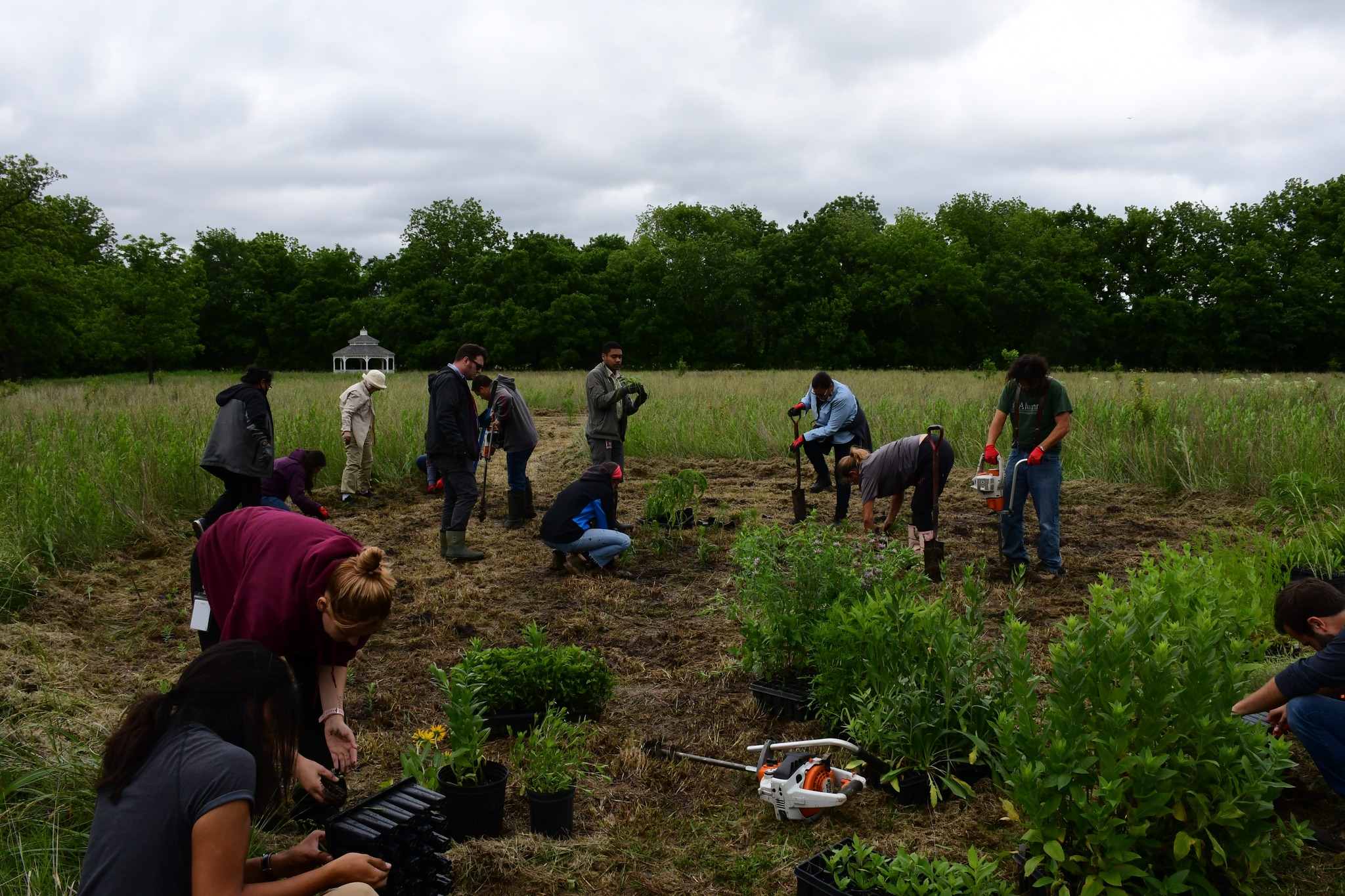Volunteers planting seed plugs.