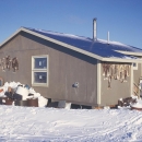 A Selwik house in winter with caribou leg skins drying on side of building.