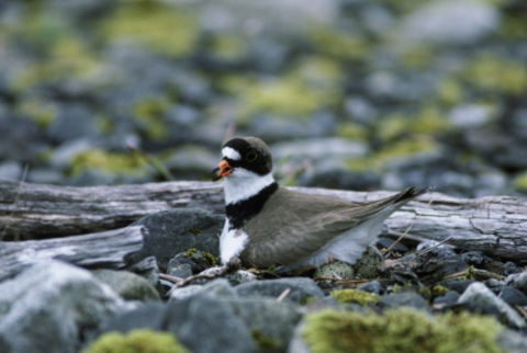 Close view of bird sitting on nest and eggs among rocks and driftwood on Kodiak Island, Alaska. For more information about shorebirds visit http://www.fws.gov/birds/.
