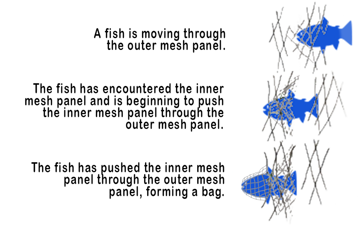 This series of three stages illustrate the process of capturing a fish by “bagging” in a trammel net.