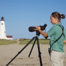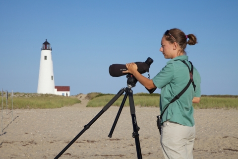 The lighthouse is in the background as a U.S. Fish and Wildlife Service biologist studys shorebirds on Nantucket National Wildlife Refuge.