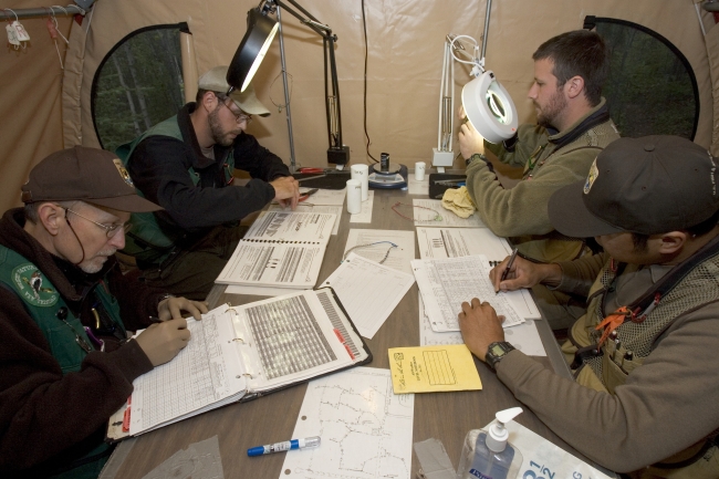 This is a picture of four U.S. Fish and Wildlife Service biologists reviewing data around a table. The Alaska Highway is the northern boundary of the 682,604 acre Tetlin Refuge for 65 miles northwest of Alaska-Yukon border. From scenic overlooks you can view wetlands important to breeding waterfowl, and boreal forests and alpine habitats important to moose, caribou, grizzly and black bears, wolves and Dall sheep. The preservation of these lands for wildlife represent the legacy of early conservationists. Our responsibility is to bequeath these lands and the animals living here to future generations. Perhaps our challenge is best underscored by the words of President Theodore Roosevelt: “Wild beasts and birds are by right not the property merely of the people who are alive today, but the property of unknown generations, whose belongings we have no right to squander." On behalf of the refuge staff and the community of Tok, I hope that you will come and visit us at the Tetlin National Wildlife Refuge. It’s a special place we can all share.