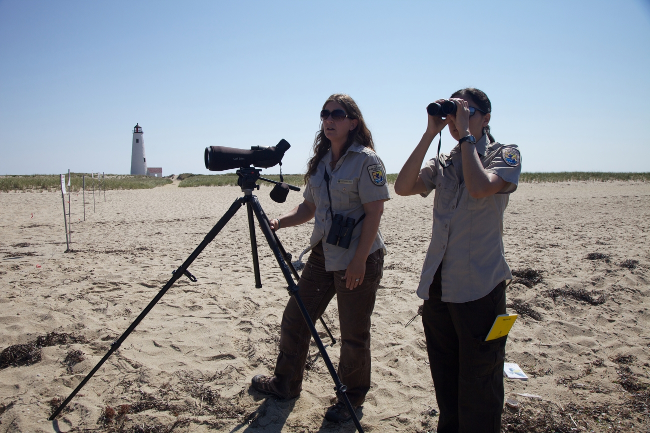 Two female U.S. Fish and Wildlife Service biologists study shorebirds.