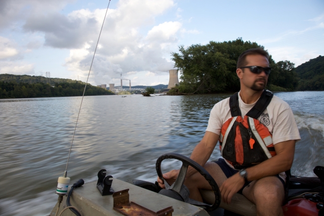 Ohio River Islands National Wildlife Refuge personnel in a boat on the Ohio River.