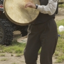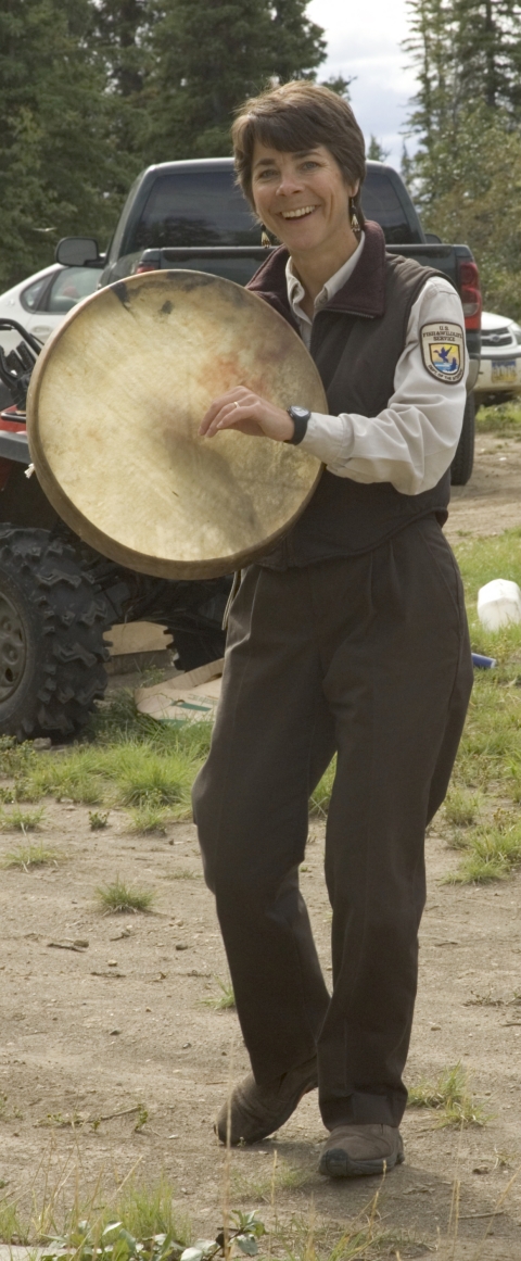 A U.S. Fish and Wildlife Service employee with a drum- or instrument-like artifact at Tetlin National Wildlife Refuge.