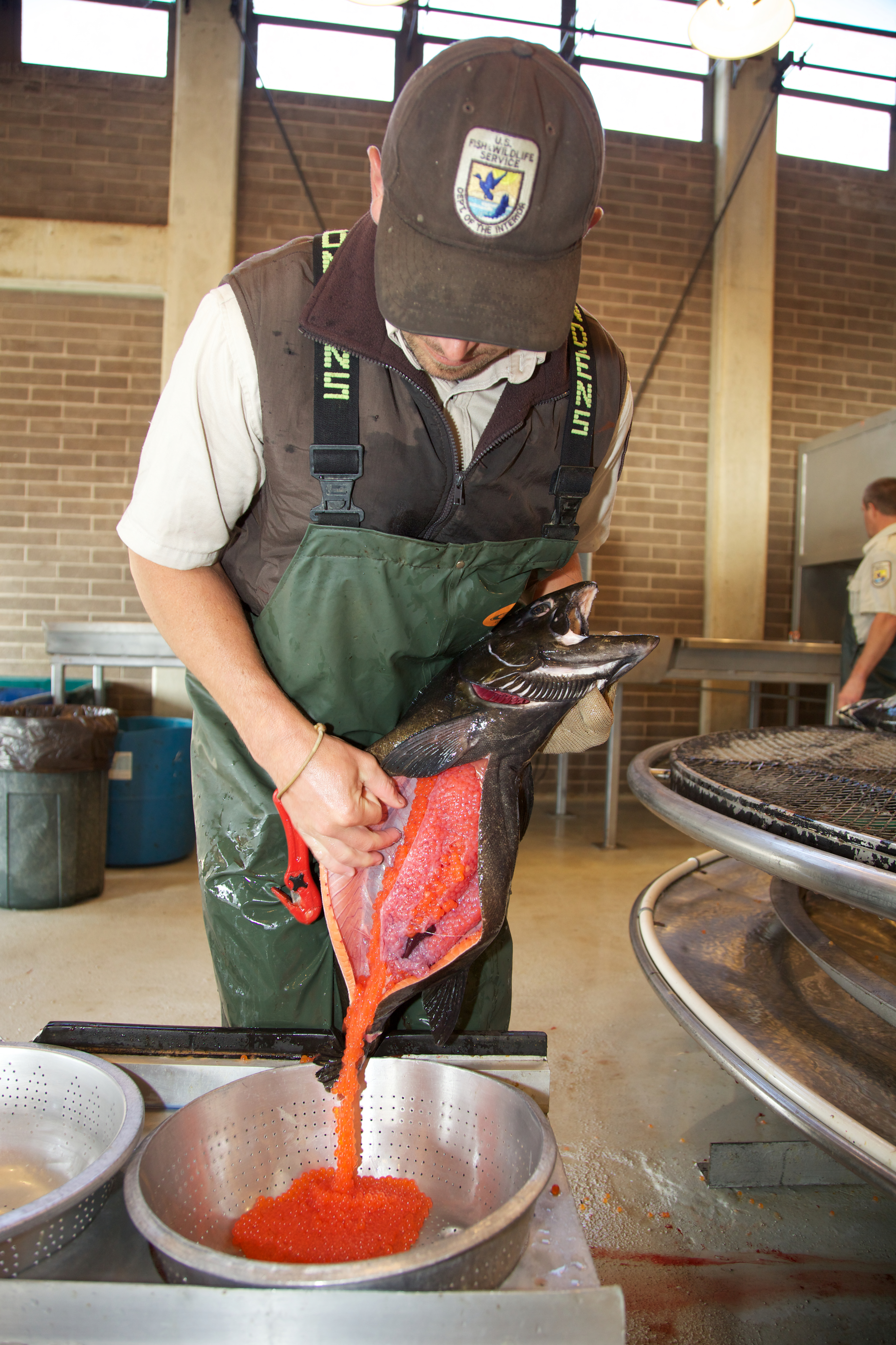 U.S. Fish and Wildlife Service employee collecting salmon eggs. Pacific Northwest Fisheries.