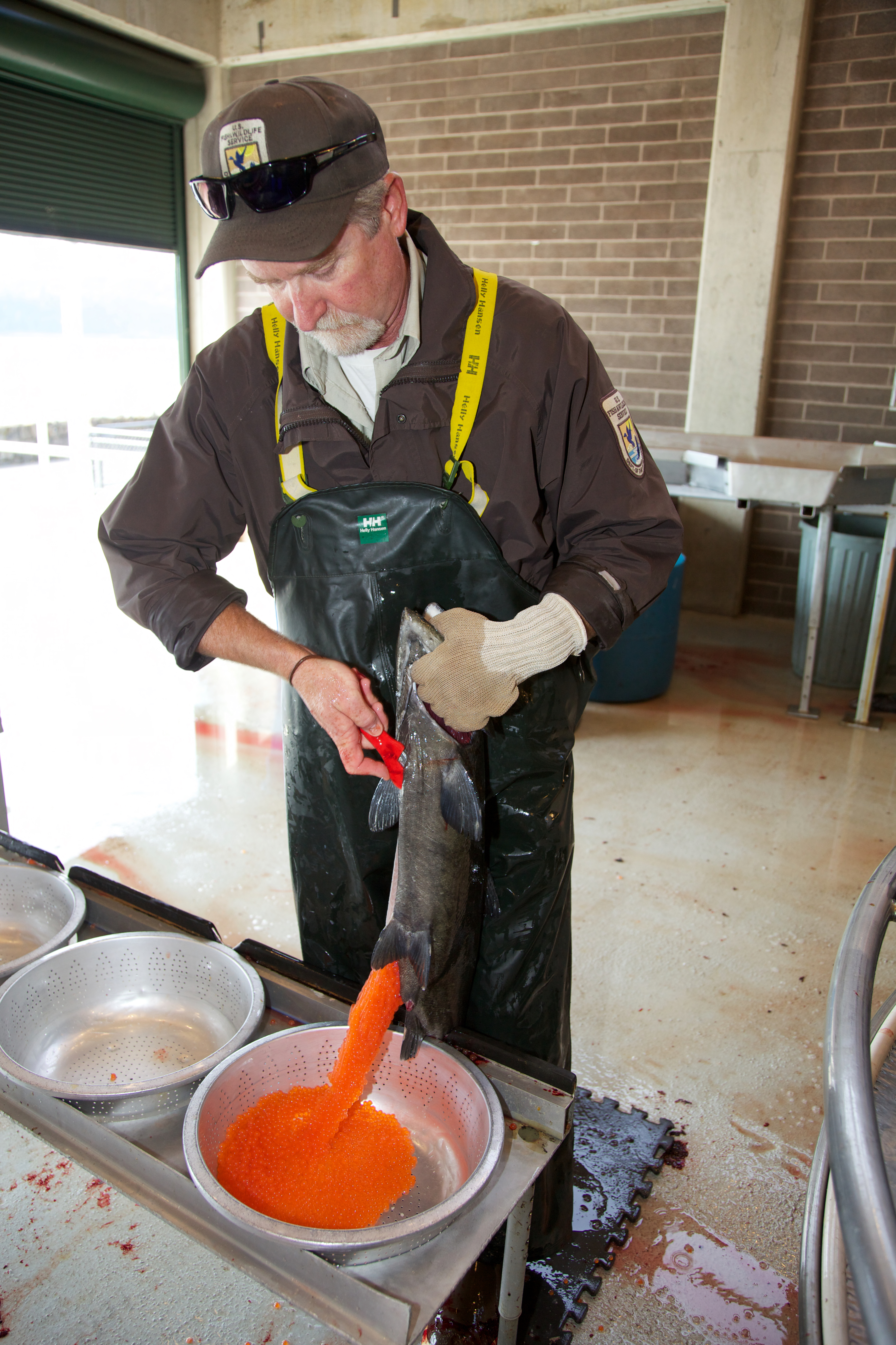 The eggs are removed from the females and placed in a container. Each female Chinook has between 4,000-5,000 eggs. Pacific Northwest Fisheries.
