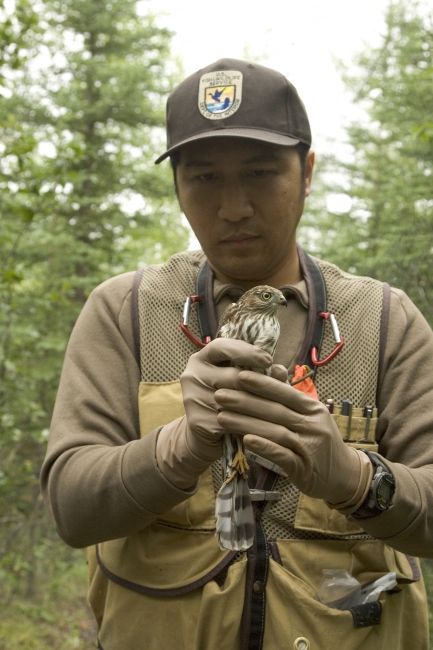 A U.S. Fish and Wildlife Service employee holding a Sharp-shinned Hawk.