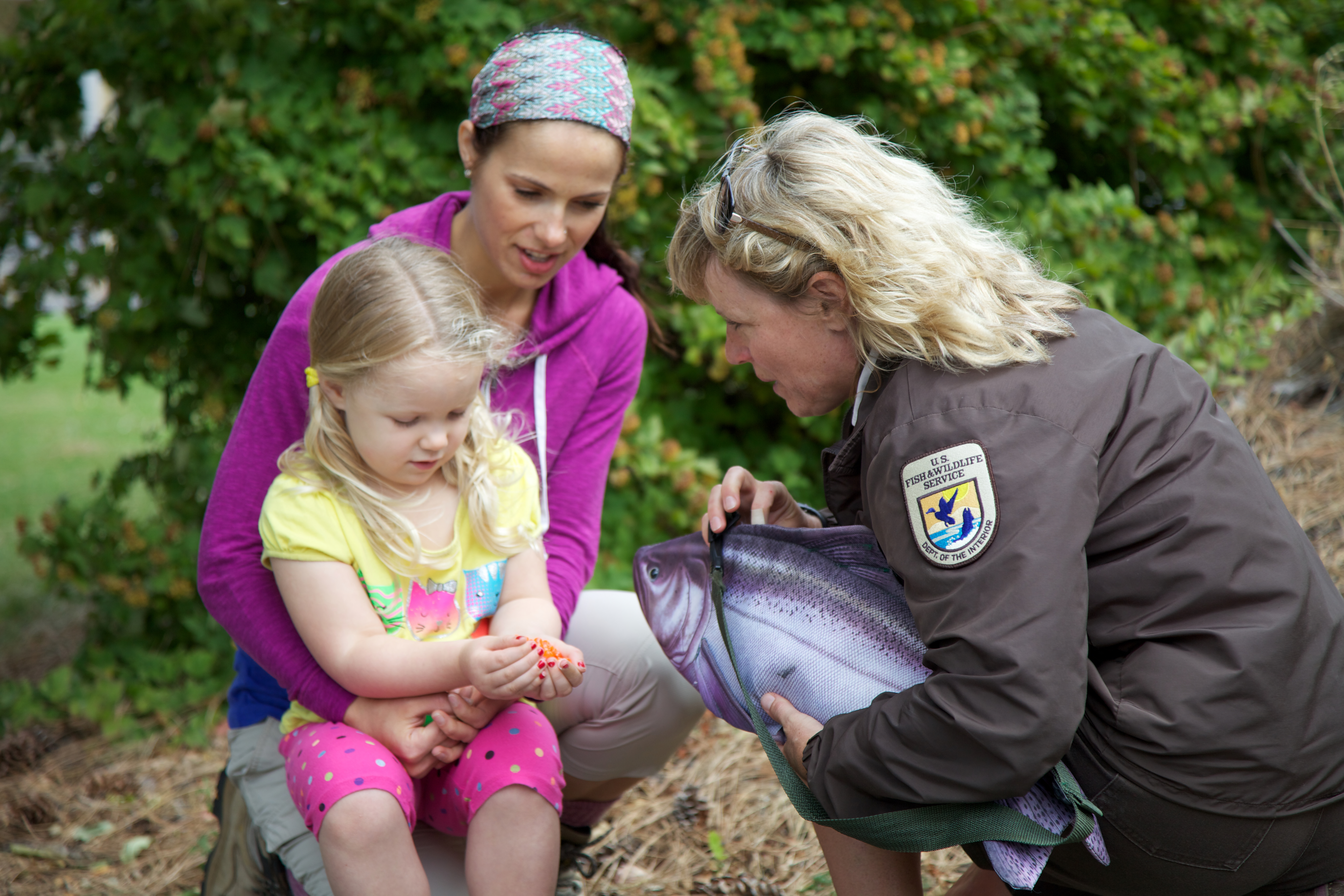 A U.S. Fish and Wildlife Service employee demonstrates a life cycle simulation of a Pacific salmon to a mother and child. Pacific Northwest Fisheries.