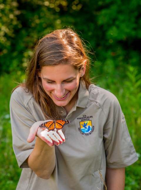 U.S. Fish and Wildife Service employee with a Monarch butterfly.