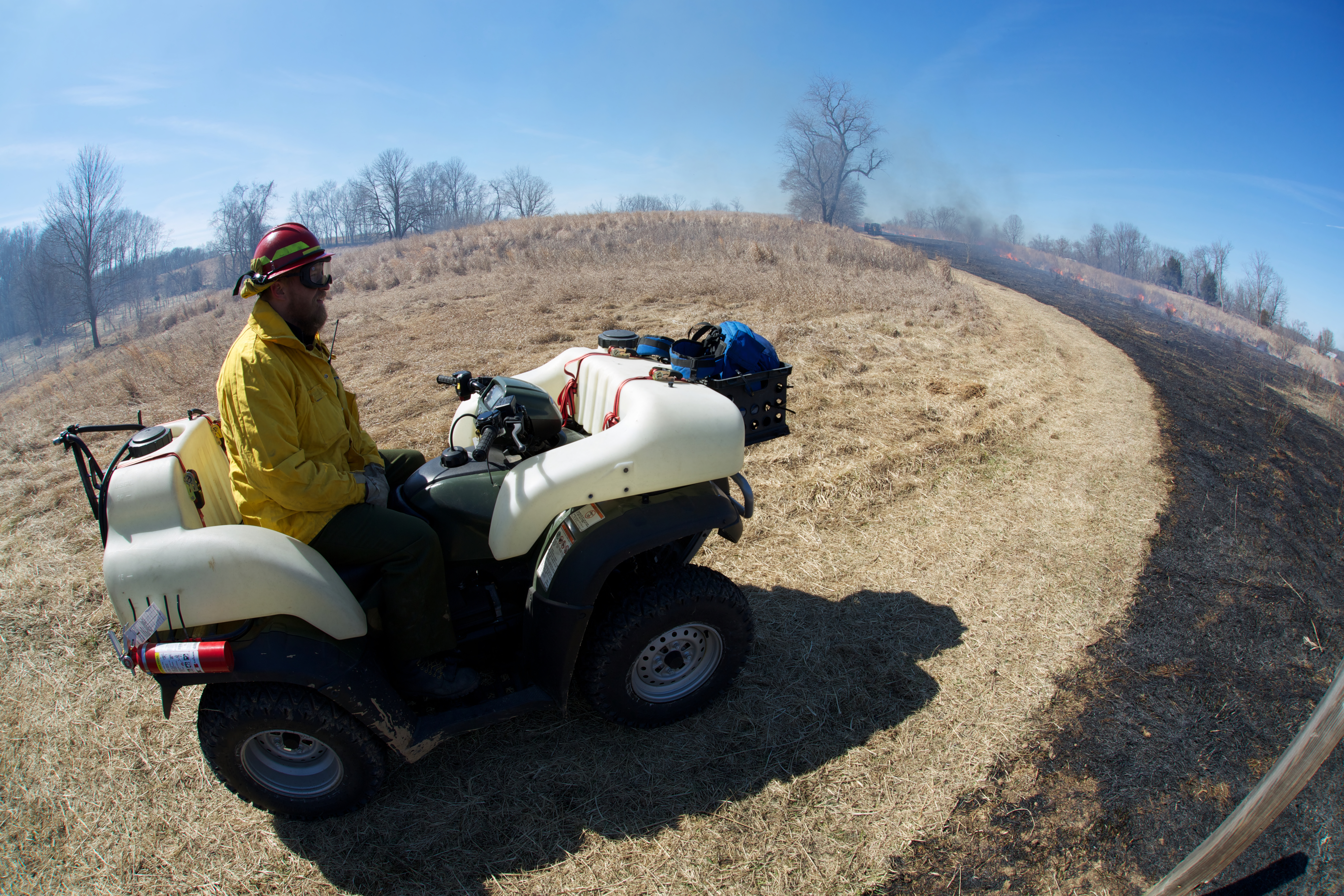 U.S. Fish and Wildlife Service employee, Casey Johnson, in ATV monitoring prescribed burn at NCTC