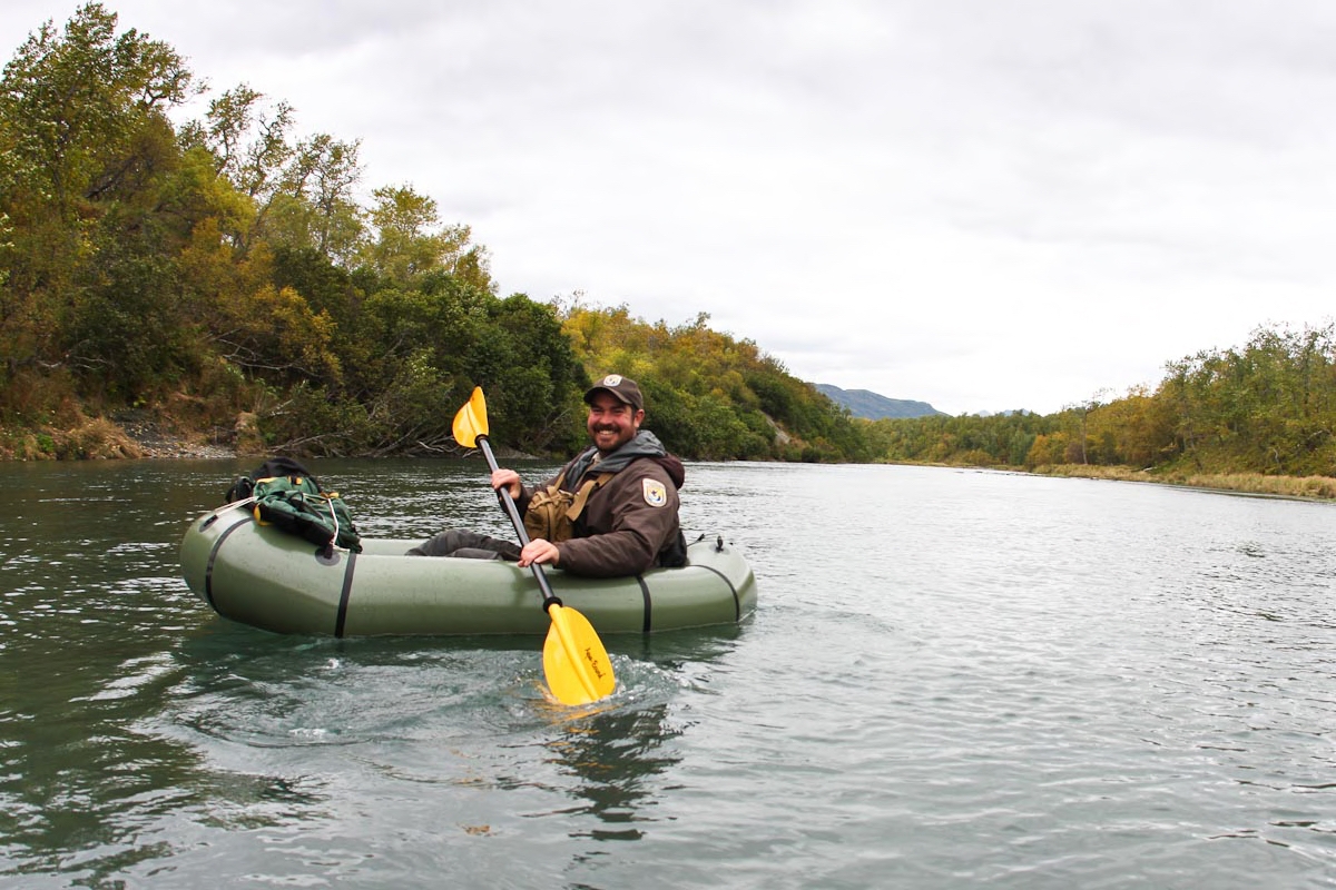 A U.S. Fish and Wildlife Service employee paddling a river raft